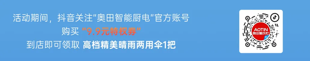 活動(dòng)期間,狂撒福利!抖音關(guān)注 “奧田智能廚電” 官方賬號(hào),9.9元特權(quán)券限時(shí)開(kāi)搶?zhuān)∪蟾@B加,手慢無(wú),速掃碼參與!
