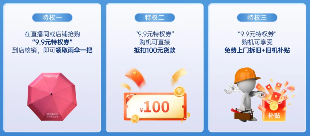 “9.9 元特權(quán)券” 在購(gòu)機(jī)時(shí)可直接抵扣 100 元貨款。無(wú)論是買(mǎi)煙灶套裝還是購(gòu)買(mǎi)蒸烤一體機(jī),直接省100元?;ㄐ″X(qián)省大錢(qián),讓您實(shí)實(shí)在在享優(yōu)惠!
