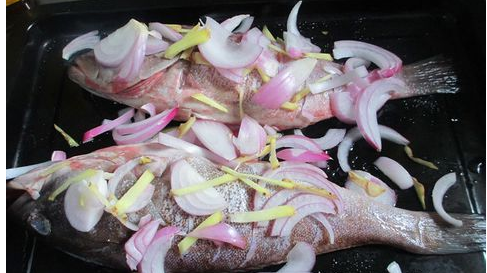 第二步:用刀具在魚背上橫切幾刀,加入一些配菜,比如金針菇、干豆腐等等,依照個(gè)人口味添加,然后加入花椒、八角、鹽、料酒等進(jìn)行調(diào)味,隨后放入奧田集成灶90TT的蒸烤箱內(nèi)。