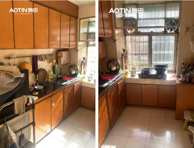 用戶家自建房廚房用了20年,吸油煙力弱,炒個辣椒全家嗆得流淚。櫥柜門板脫落,餐具堆在潮濕角落,梅雨季總有一股霉味。